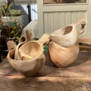 北欧・英国に伝わる昔ながらの手法で、原木を斧で割って、はつり、ナイフで手削りし、天然の植物油や蜜蝋で仕上げています。